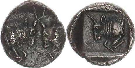 AR Hemiobol (1/2 obolu) 0,40 g, A: Přední části býků proti sobě p ři zápasu / přední část býka