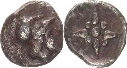 AR Hemiobol (1/2 obolu) 0,36 g, A: hlava zprava v přilbě / hvězdi ce