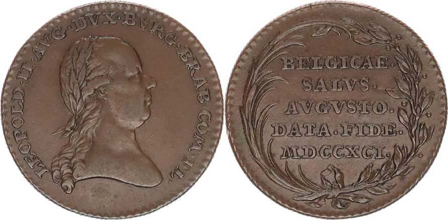 Velký žeton na holdováni v Belgii 1791, Portrét císaře zprava a o pis / 5-ti řádk. nápis ve věnci Cu 27 mm "R" Nov. XVI/ K/ 6b