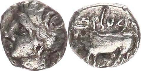 AR 3/4 obol (8 mm, 0,44 g), mužská hlava vlevo / býks mužskou hla vou vlevo SG: 783; Jenjins: pl.24 č.24 "R"