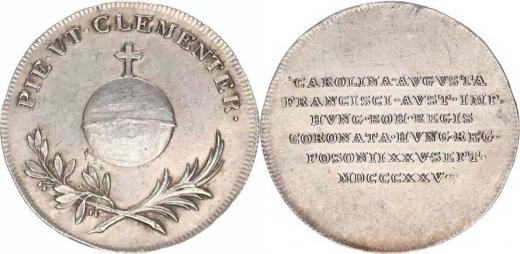 Velký žeton na uherskou korunovaci Karoliny Augusty 25.9.1825 v Bratislavě Ag 25 mm Nov.XVII/V/1b