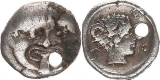 AR Hemidrachma (13 mm, 1,61 g), Hlava Gorgony čelně / hlava Artem is Parthenos vpravo NEOTI SG: 1417; BMC: 5.17 "R" _dírka