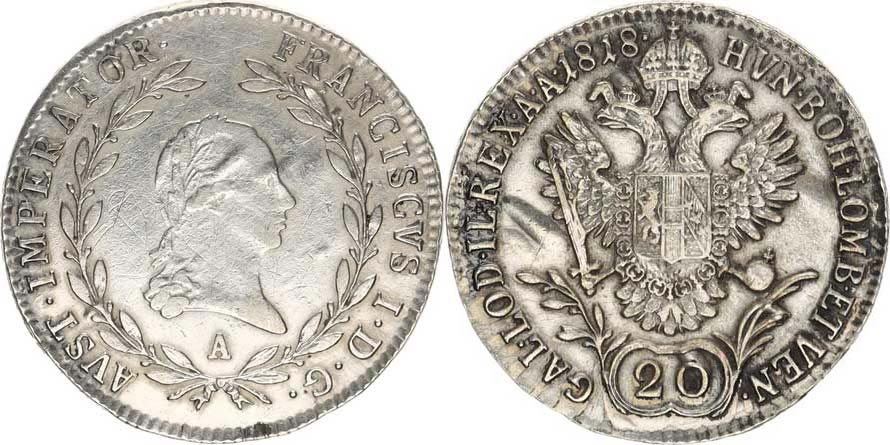 20 kr. 1818 A_vada stř., zbytky patiny, tém.