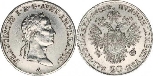 20 kr. 1832 A - var.: tečka mezi A a datací u horní nožičky čísl. 1_ mír. just. při hr.