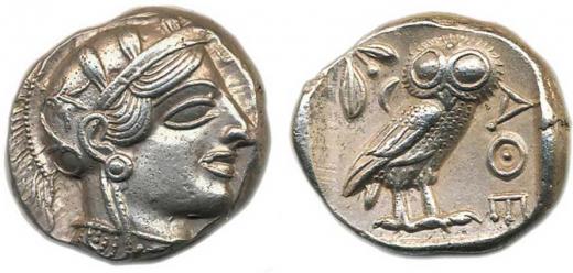 Tetradrachma, hlava Athény zprava / Stojící sova, za ní olivová r atolest A (TH) E Sear 2526 17,156 g "sbírkový kus"