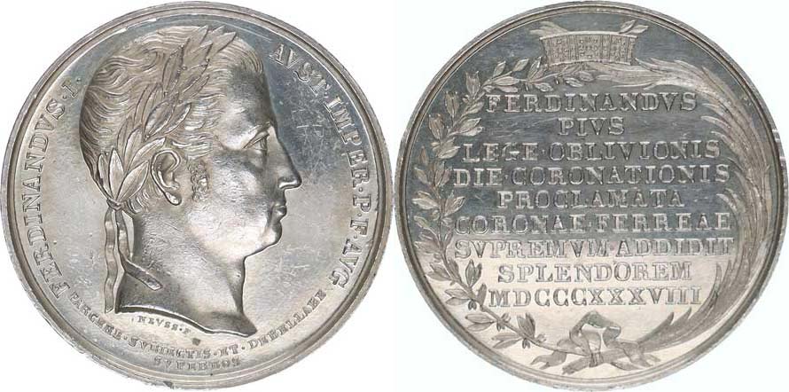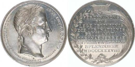 Medaile na korunovaci Lombardsko-benátským králem 6.9. 1838 v Mil áně, sign.: NEVSS. F. Ag 33 mm 13,58 g Novák XVIII/G/5a; Mont. 2583