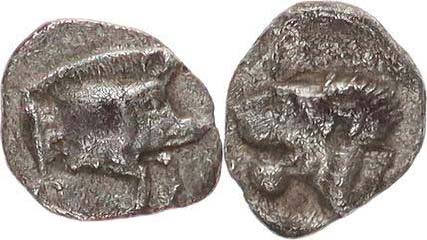 AR 1/2 obol, 0,33 g; A: Přední část kance zleva / hlava lva zleva Sear 3848