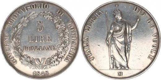 5 Lire 1848 M - krátké konce ratolestí věnce nad letopočtem, hvěz da nad korunou Nov. 39a; Veselý 12 24,97 g_dr. rys.