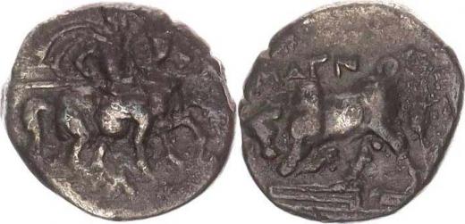 AR diobol, 1,41 g; A: Jezdec s oštěpem zprava / útočící býk zleva , obilný klas Boston 1881; Warren 1122