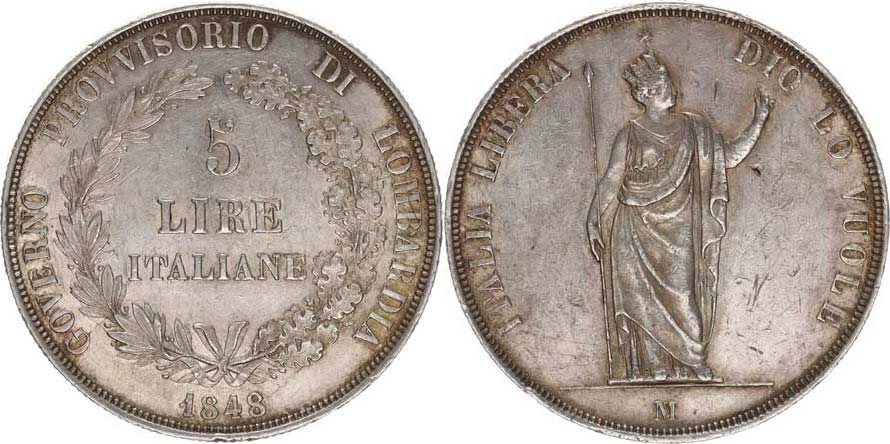5 Lire 1848 M - krátké konce ratolestí věnce nad letopočtem, hvěz da nad korunou Nov. 39a; Veselý 12 24,978 g_rys., tém.