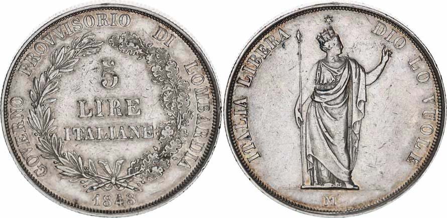 5 Lire 1848 M - dlouhé konce ratolestí věnce nad letopočtem, hvěz da u koruny Nov. 39 b "R" 24,946 g_zc. nep. hr.