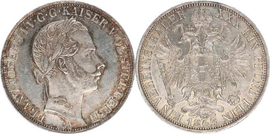 Tolar spolkový 1863 A_u kraje zlat. patina