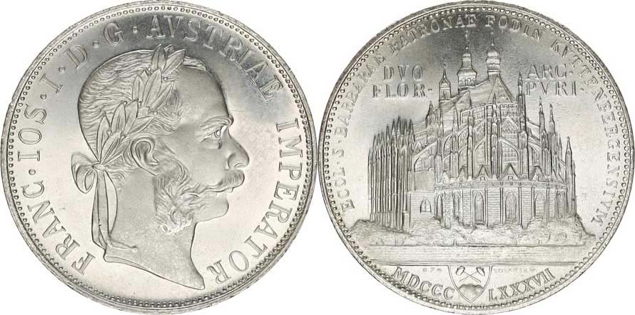 Dvouzlatník 1887 - Kutná Hora sign.: KOLÁŘSKÝ 1974 (Novoraž ba) Ag 36,2 mm 22,457 g Moravec 69; Frühwald 1904