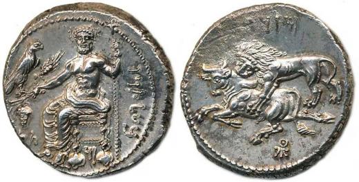 Statér (10,852 g); A: Trůnící bůh Baal drží v levé ruce dlouhé že zlo, v pravé ruce orla. Aramejský text BALTRZ, pod trůnem M / Lev zleva útočí na býka, nad ním jméno krále v aramejštině MZDI (Mazaios) SNG Levante 106 "R"