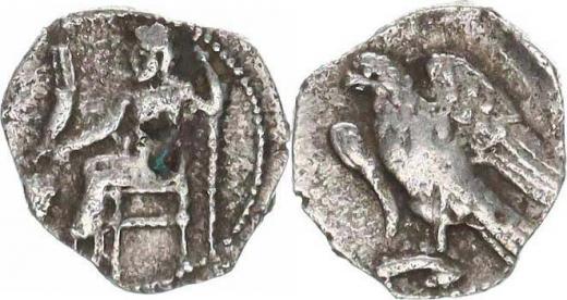 AR obol, 0,80 g; A: Baal sedí vlevo a drží velký obilný klas a hr ozen / Orel stojící vlevo na radlici SNG 316