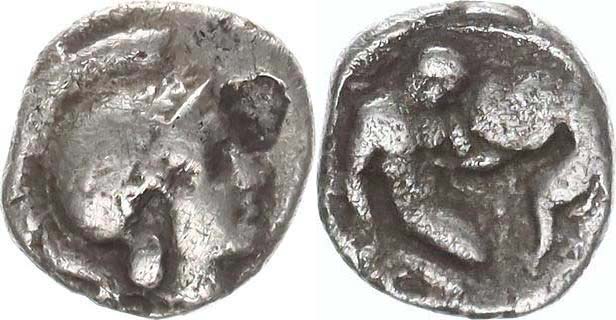 AR Obol (11 mm, 0,97 g), Hlava Atheny v attické přilbě vpravo / b ojující Herakles s nemejským lvem Vlasto 1270; jako SG: 351 "R"