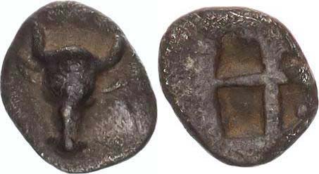 AR Hemiobol (1/2 obolu) 0,39 g; Býčí hlava / Quadratum incusum Klein 316