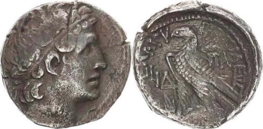 Tetradrachma (r. 100-99 př. Kr.), Hlava Ptolemaia I. s diadémem z prava / stoj. orel se složenými křídly na blesku vlevo, značka de lta Ag 26 mm 11,865 g Sear 7940; BMC 6. 113,29