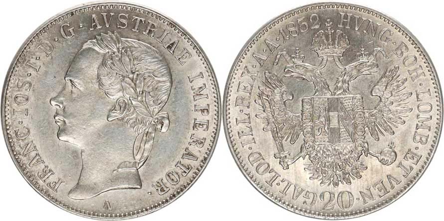 20 kr. 1852 C - hlava vlevo "RR" 6,654 g