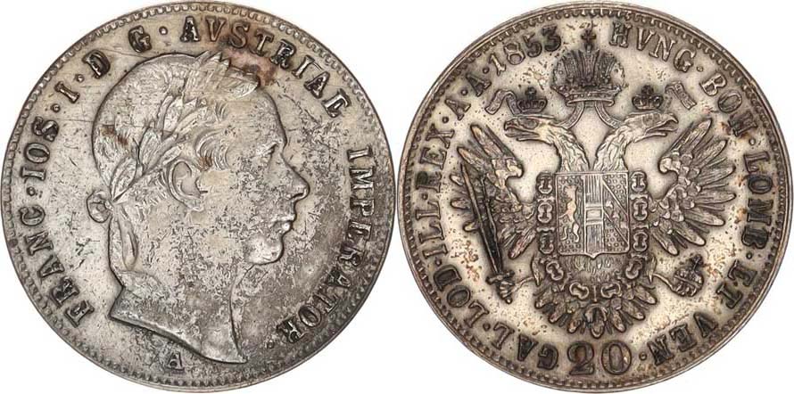 20 kr. 1853 A_dr. rys., vada stř. v Av.