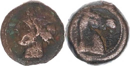 AE 18, Hlava Tanit zleva / hlava koně zprava s malou palmou, vše v perlovci SGI: 6528; Müller: II, 103, 304; SZMW: 6664 5,16 g