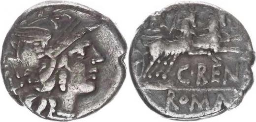 Denár, hlava Romy zprava, za ní X / Victoria v kozí bize jedoucí doprava, dole C. RENI, v ex. ROMA Craw. 231/1; A. 889; Vesel : 1027; Sincona, Aukce 17, Zurich 21. 5. 2014