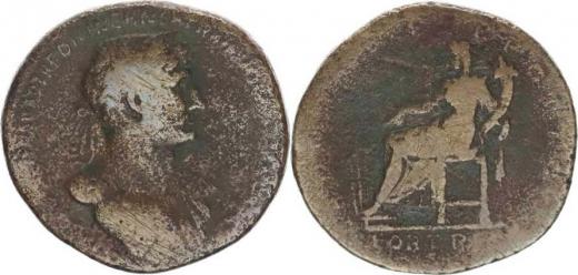 Sestercius, sedící Fortuna drží kormidlo a roh hojnosti SENATVS POPVLVSQVE ROMANVS v úseči FORT RED / S C BMCRE 1026; CBN 847; Cohen 158 (4 Fr.); RIC 652"R"_nečitelný opis