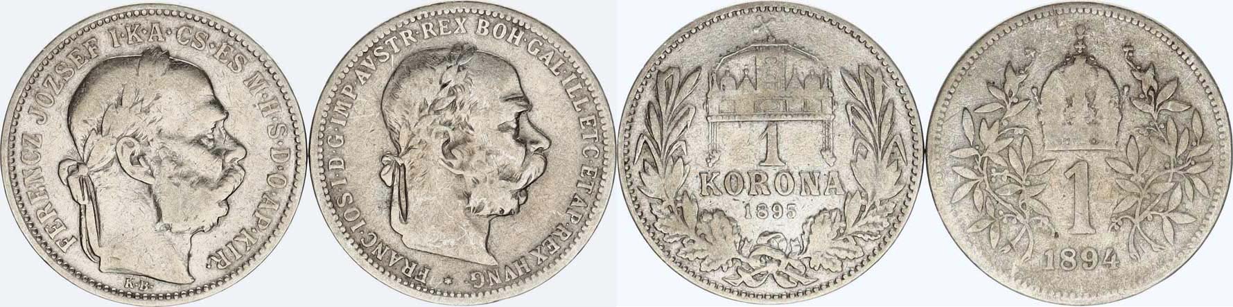 1 Koruna 1895 KB, +1 Koruna 1894 b.zn. 2 ks