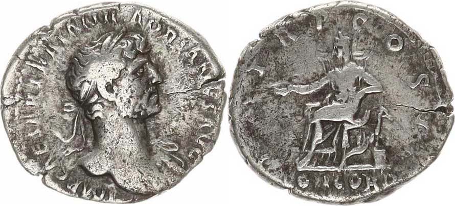 Denár, sedící Concordia drží obětní misku a druhou ruku opírá o t růn P M TR P COS II - CONCORD RIC II.3-108