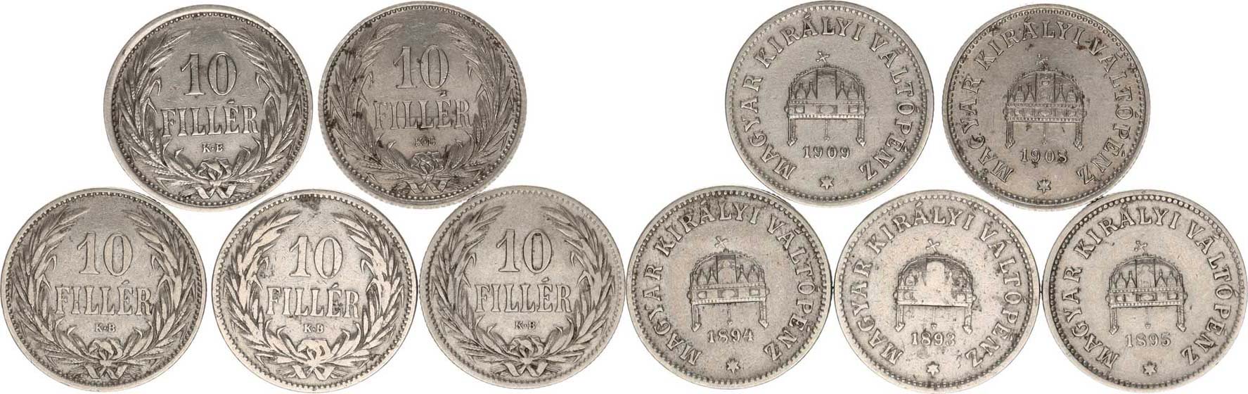 10 Fillér 1893, 1894, 1895, 1908, 1909 vše KB 5 ks
