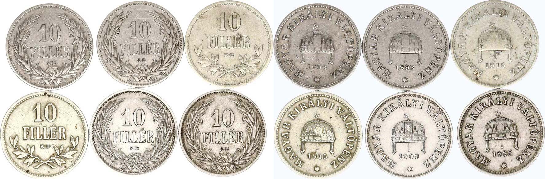 10 Fillér 1893, 1894, 1895, 1909, 1915, 1916 vše KB 6 ks
