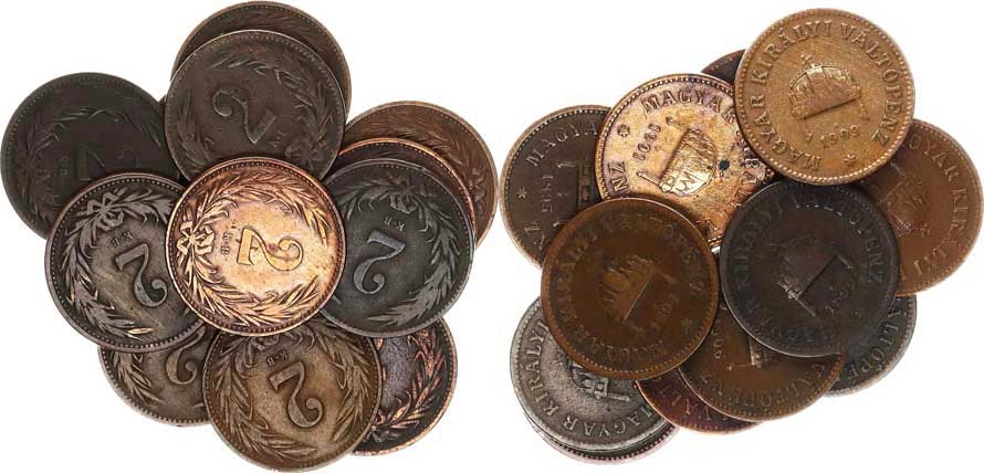 2 Fillér 1894, 1895, 1896, 1897, 1898, 1899, 1901, 1905, 1906, 19 09, 1910, 1914 vše KB 12 ks