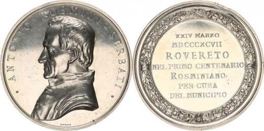 Antinio Rosmini - Serbati, poprsí zleva, opis / Město Rovereto k 100. výr. narození italského filosofa, theologa a státníka 1897, 7-mi řádk. nápis ve věnci sign.: JOHNSON Ag 47,5 mm 40,35 g "R" Wurzbach 7989 "patina"