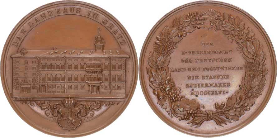 Graz - 10. setkání němec. zemědělských a lesnických hospodářů 184 6, pohled na zemský dům v Grazu, opis / sedmiřádk. německý nápis ve věnci sign.: K. Lange Cu 49 mm Ho. 6242; Un. 1851
