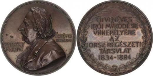 Uhry - Pulszky Ferenc, poprsí zleva, nápis ve dvou řádcích / Za 5 0 let literání práce věnuje archeologická společnost 1834-1884, 7 mi řádk. maďarský nápis ve věnci sign.: A.SCHARFF Cu patin. bronz 47 mm 45,39 g (m.j. rodák z Prešova) "R"