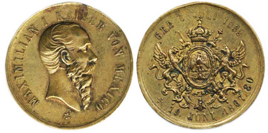 Maximilian I. arcivévoda a císař Mexika - úmrtní medaile 1867 hlava zprava, opis / znak mexického císařství, opis - doraženo 03 mosaz 22,5 mm 3,653 g "R"