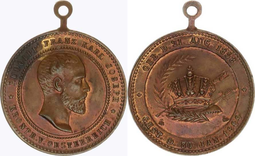 Rudolf Franz Karl Josef - rakouský korunní princ, úmrtní medaile 1889, hlava prince zprava / Na podušce leží koruna, žezlo, šavle a ratolest, opis Cu 26 mm původní ouško
