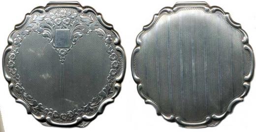 Dámská Ag pudřenka, 30 léta 20. stol. mušlového tvaru 85,5x85,5 m m punc 835/1000 107,2 g "pěkná práce"_tém.