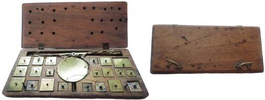 Váhy na zlaté mince (kolem r. 1800) bez označení výrobce. Dřevěné pouzdro 19x8x2 cm obsahuje mosazné rovnoramenné váhy s miskami o průměrru 4,5 cm a 20 ks závaží (na říšské dukáty, němec. Carolins, francouz. Louis d´or, nizozemské Souverains d´or a Napole onor)