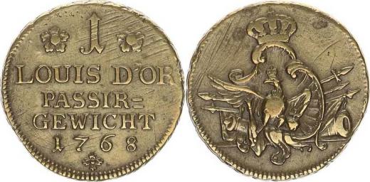 Mincovní závaží - Prusko, Friedrich II. (1740-1786) "1" LOUIS D´OR / PASSER / GEWICHT / 1768* mosaz 22 mm 6,48 g_dr. rys.
