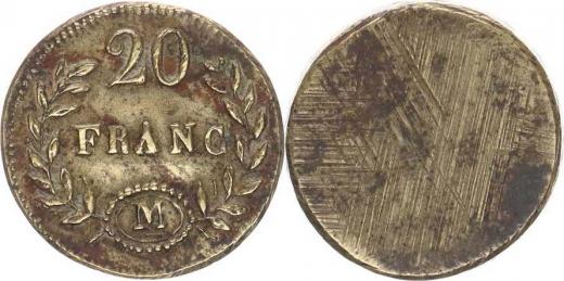 Mincovní závaží - Itálie (19. stol.), "20 FRANC", značka "M" mosaz 22 mm 6,47 g