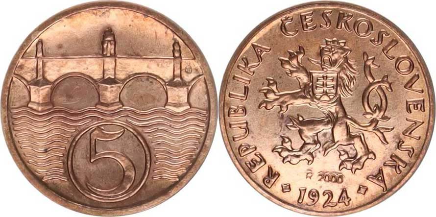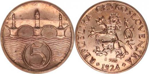 5 hal. 1924 - pamětní ražba mincovny Kremnice v r. 2000 kapsle +orig.etue +certifikát (raženo 1000 ks)