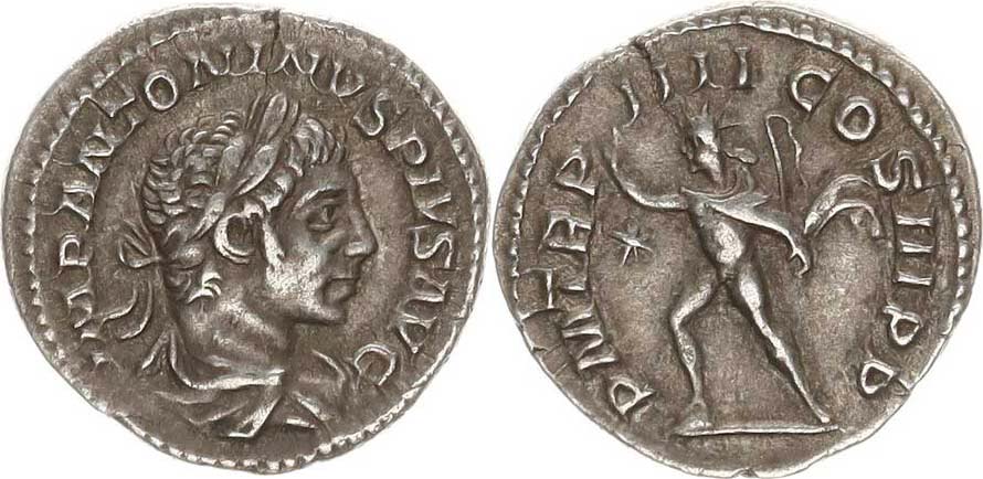 Denár, kráčející Sol s bičem, v poli hvězda PM TRP III COS III PP Kank. 21; Kamp. 56.42; RIC 37 2,688 g