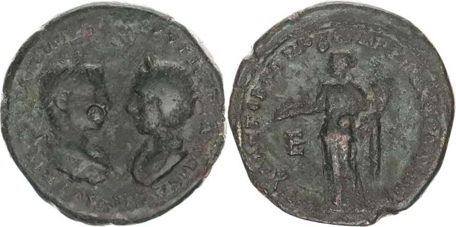 Moesia Inferior-Marcinopolis; AE 26, A: Portréty proti sobě, opis / stoj. Concordia zleva, drží pateru a roh hojnosti, pod rukou pí smeno E Moushmov 681; AMNG I 964; BMC Thrace p. 36, 62-63;