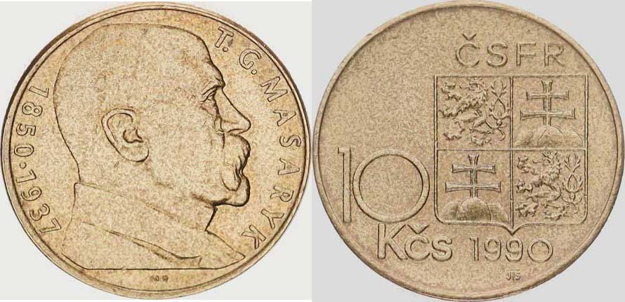 10 Kčs 1990 - T.G.Masaryk, var.: bez tečky mezi "MR"#A Novotný 83a "RR"