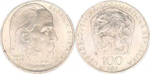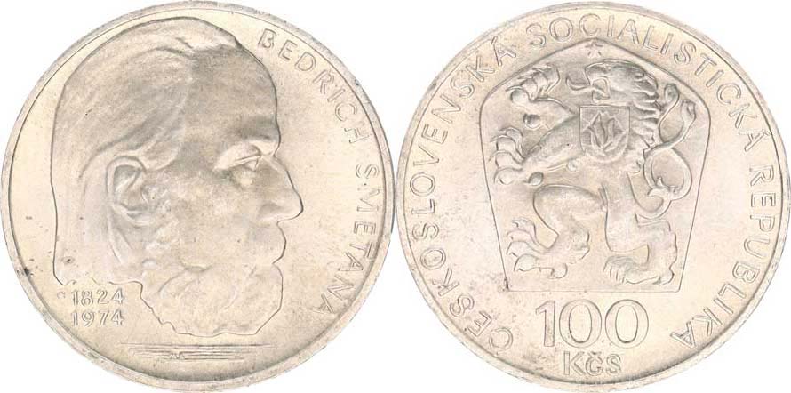 100 Kčs 1974 - Smetana, -nápis na hr. čitelný z Av. (od portrétu)