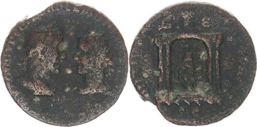 AE 29; A: Dva portréty proti sobě, opis nečitelný / sedící božstv o v chrámu, v úseči SC 16,174 g