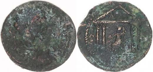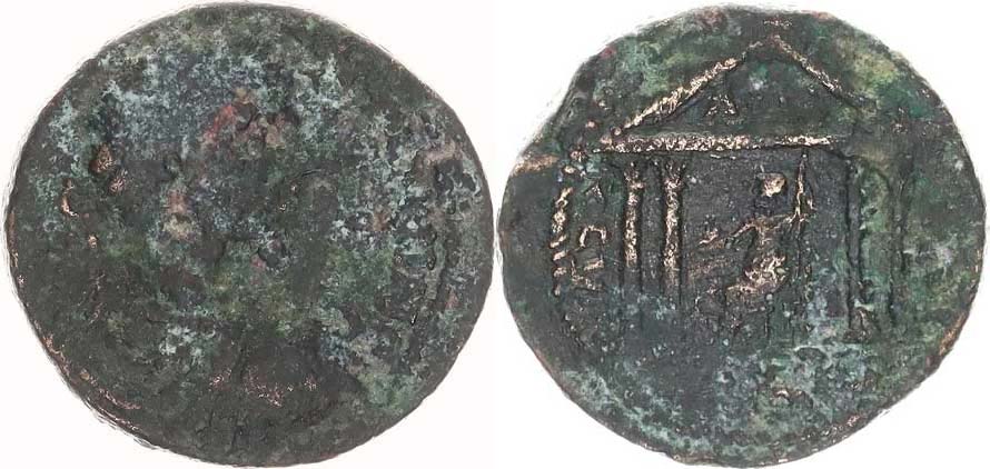 AE 29; A: Poprsí zprava, opis nečitelný / sedící božstvo v chrámu 15,072 g