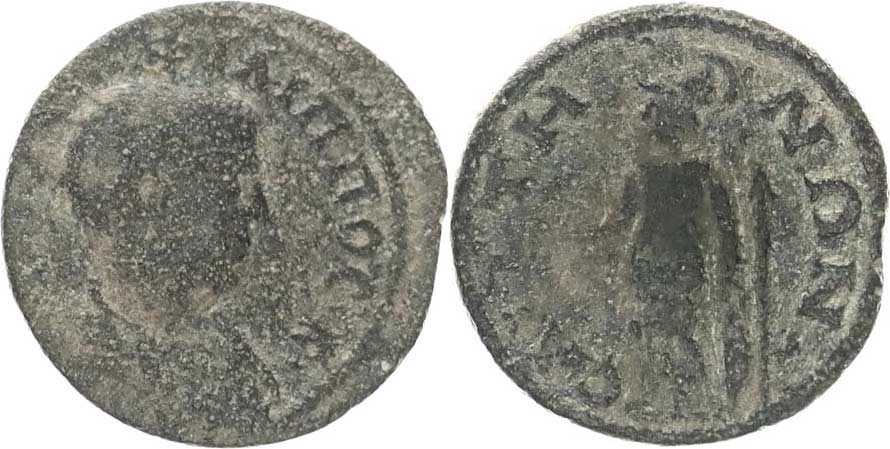 Phrygia-Saitta; AE 23, A: Portrét vpravo, opis / stoj. Athena vle vo s žezlem, štítem a kopím SG: 4106; BMC: 22.225.68