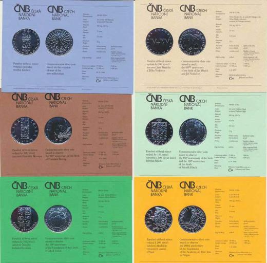 Certifikáty k českým pamětním mincím 1999 - 2005, 6 ks - Voskov ec a Werich, Škroup, Fibich, Fotbalový svaz, Akademie výtvarného umění, Nové tisícilatí